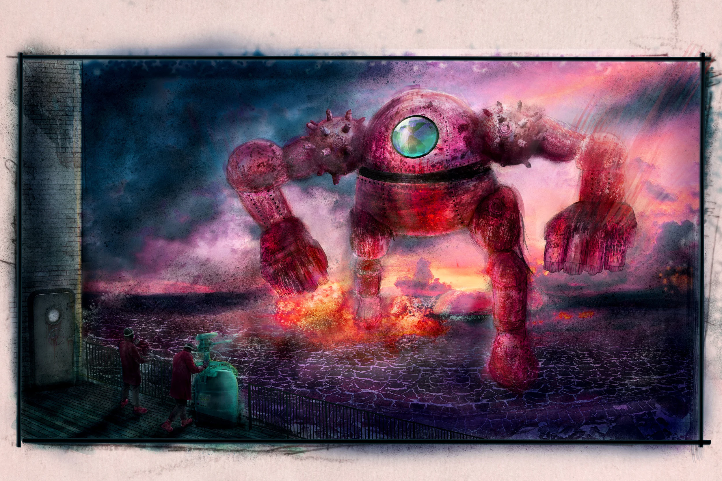 Concept art using various techniques such as photo-bashing, traditional sketching, and digital painting